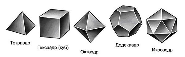 По аналогии с правильными плоскими фигурами - многоугольниками - в пространстве определяют правильные многогранники: многогранник называется правильным, если все его грани - равные друг другу правильные многоугольники, а все его двугранные углы равны между собой. Мы знаем, что существует правильный многоугольник с любым количеством сторон, т.е. число видов правильных многоугольников - бесконечно. Однако для правильных многогранников это не так. Еще Евклид доказал, что существует всего пять видов правильных многогранников. Предложение, которым он завершает свои “Начала”, звучит так: “Вот я утверждаю, что кроме упомянутых пяти тел нельзя построить другого тела, заключенного между равносторонними и равноугольными равными друг другу многоугольниками.”